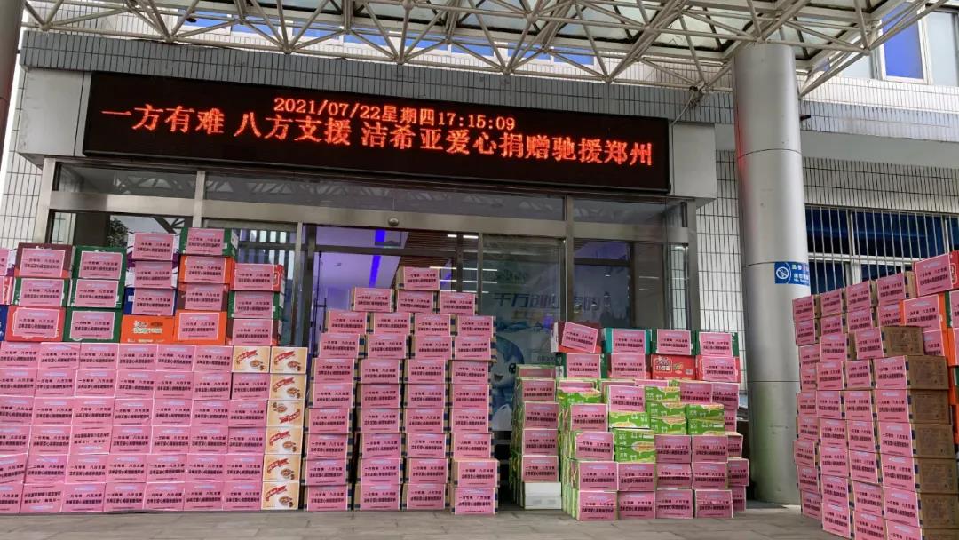 在凌晨三點聯系各大市場及超市采購大米、面粉、方便面、牛奶等防汛救災保障性物資送往災區,并第一時間聯系鄭州市紅十字會,不到24小時的時間,救援物資準時從潔希亞總部裝車發出!