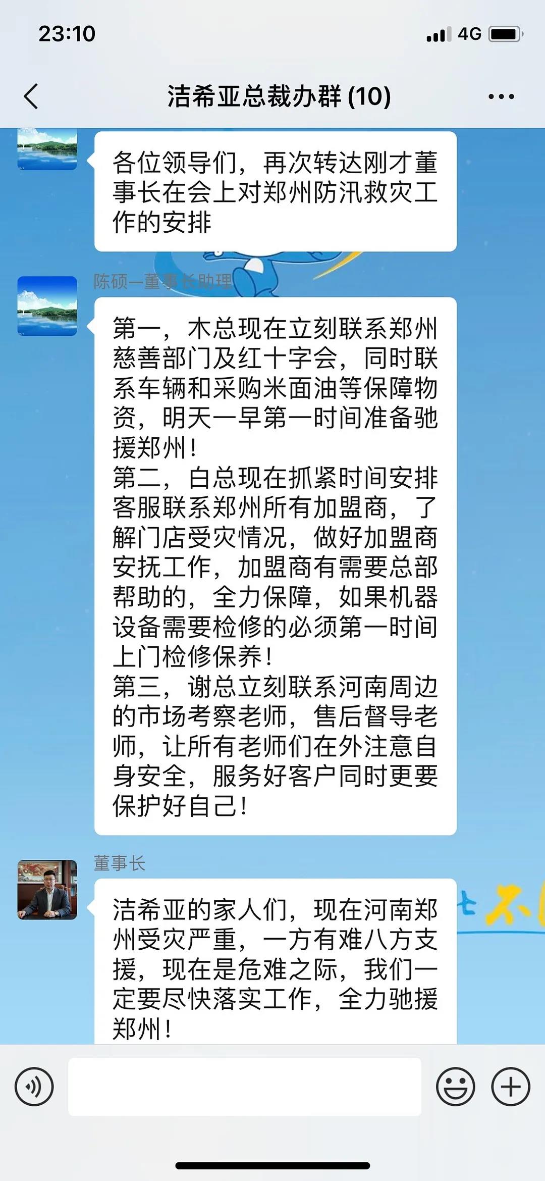 收到災情訊息后,7月21日晚,潔希亞董事長陳友兵連夜召集公司高層召開防汛救災會議,并成立“抗災救援及物資支援小組”。